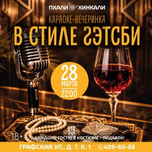 Приготовьтесь окунуться в атмосферу декаданса и блеска на нашей драгоценной караоке-вечеринке! 28 марта, ровно в 22:00, ресторан "ПхалиХинкали" (Графская ул. 7/1) распахнет свои двери для самых гламурных гостей.