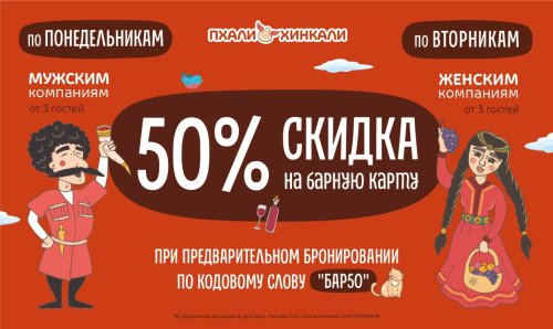 • По понедельникам - 50% скидка мужским компаниям от 3-х гостей при предварительном бронировании и кодовому слову "БАР50"