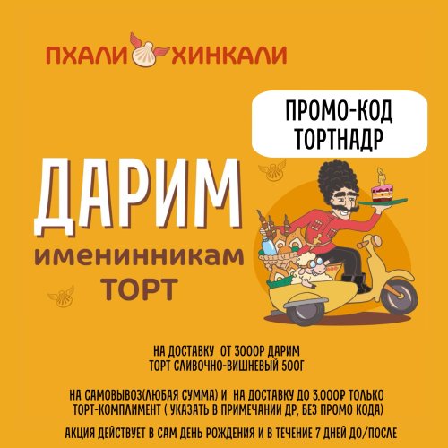 День рождения в «ПхалиХинкали»! Каждого именинника мы угощаем десертом от шеф-повара со свечой и поздравлением от семьи ресторана. Акция действует 7 дней до и 7 дней после дня рождения при предъявлении паспорта. Дарим вишневый торт по промокоду ТортНаДР при заказе от 3 000 ₽ на доставку. Акция действует при заказе на сайте.