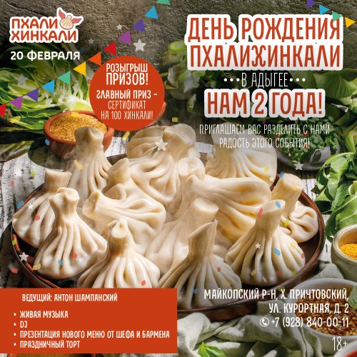 20 февраля – День Рождения ресторана «ПхалиХинкали Адыгея»! Отмечаем вторую годовщину вместе с искрометным ведущим Антоном Шампанским. В этот вечер вас ждет завораживающая живая музыка, зажигательные ритмы от DJ, аппетитная презентация нового меню и, конечно же, роскошный праздничный торт! Розыгрыш призов - главный приз сертиификат на 100 хинкали!