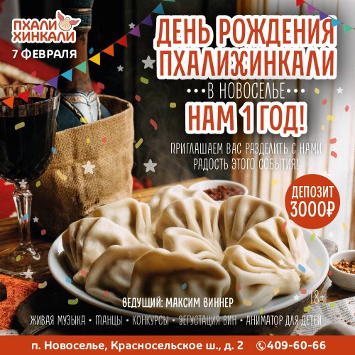 Яркий День Рождения ПхалиХинкали п.Новоселье - ресторану 1 год! Приглашаем Вас разделить с нами радость этого события вместе! Большая программа с живой музыкой, ведущим, конкурсами и подарками!