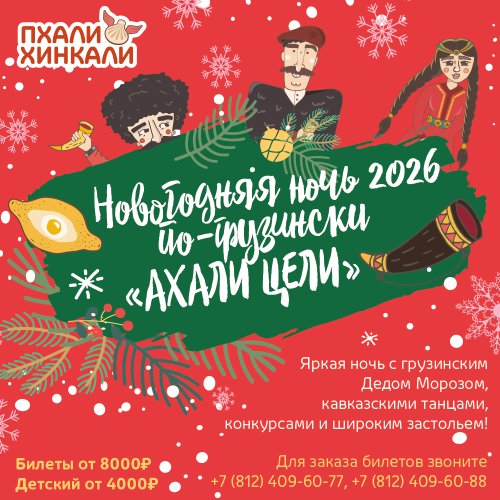It's impossible to imagine New Year's, or "Akhali Tseli," without Georgian Santa Claus (Tovlis Babua), the special Chichilaki New Year's tree, the person whose step through the door promises good fortune, Mekvle, and, of course, a bountiful feast. Just as a Russian New Year wouldn't be complete without a bowl of Olivier salad, a Georgian New Year wouldn't be complete without satsivi, khachapuri, shashlik, and churchkhela.