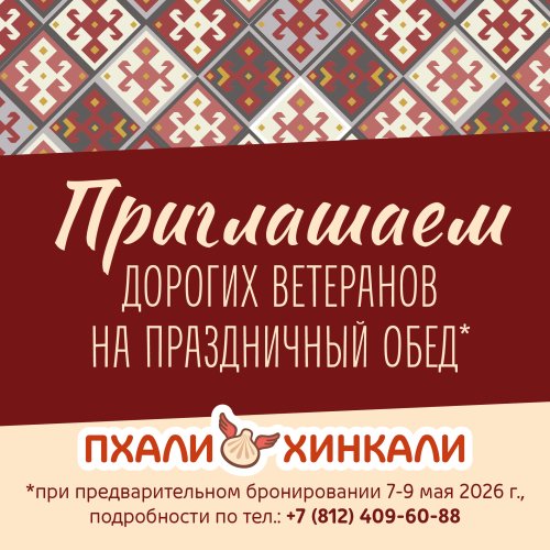 Приглашаем дорогих ветеранов Великой Отечественной войны на Праздничный обед в ресторанах ПхалиХинкали г.Санкт-Петербург.