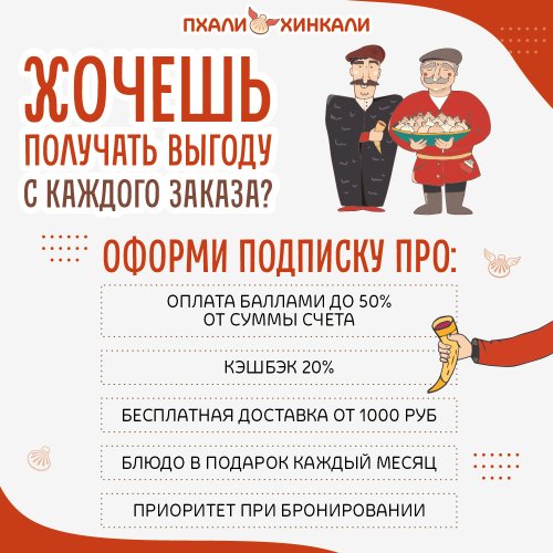 Встречайте нашу новую опцию - ПОДПИСКУ ПРО в ПхалиХинкали. Это выгодные условия для каждого гостя, оформившего подписку.