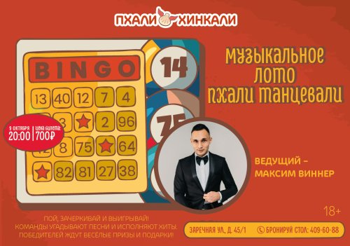 9 октября "ПХАЛИ ТАНЦЕВАЛИ" - Музыкальное лото в ПхалиХинкали на Парнасе! Яркая музыкальная игра с ведущим и бочонками, под которыми находятся песни! Самые удачливые получат призы от ресторана. Это новый формат вечеринок в Питере! Микс лото и лучших хитов с простыми правилами. Здесь караоке превращается в шоу. Пой трендовые песни, танцуй, знакомься и выигрывай подарки!