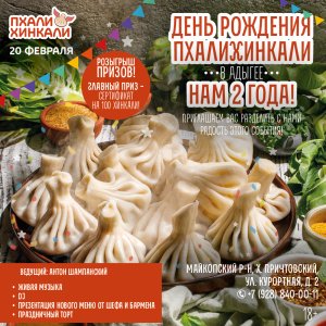 20 февраля – День Рождения ресторана «ПхалиХинкали Адыгея»! Отмечаем вторую годовщину вместе с искрометным ведущим Антоном Шампанским. В этот вечер вас ждет завораживающая живая музыка, зажигательные ритмы от DJ, аппетитная презентация нового меню и, конечно же, роскошный праздничный то... Читать дальше