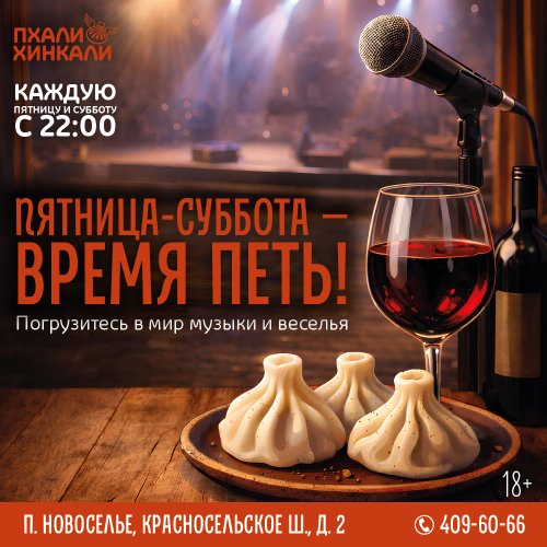 Каждую пятницу и субботу с 22:00 караоке в ПхалиХинкали п.Новоселье!