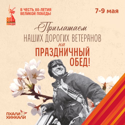7, 8 и 9 мая ПхалиХинкали приглашает ветеранов Великой Отечественной войны, тружеников тыла и жителей блокадного Ленинграда на бесплатный праздничный обед по специальному меню.