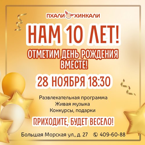 28 ноября ресторан "ПхалиХинкали" на Большой Морской отмечает свой 10-летний юбилей! Десять лет мы с любовью творили для вас кулинарные шедевры – лепили бесчисленные хинкали, выпекали румяные хачапури, согревали душевной атмосферой гостеприимства и делили с вами самые важные моменты жизни. Спасибо за вашу искреннюю любовь и тепло!