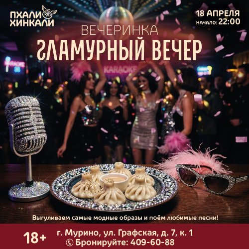 В ресторане грузинского гостеприимства "ПхалиХинкали" Мурино грядет незабываемое событие – «Гламурная вечеринка-караоке»! Позвольте себе сверкнуть в самых ослепительных нарядах, украшенных стразами и блестками, а мы окунем вас в атмосферу настоящего гламурного праздника.