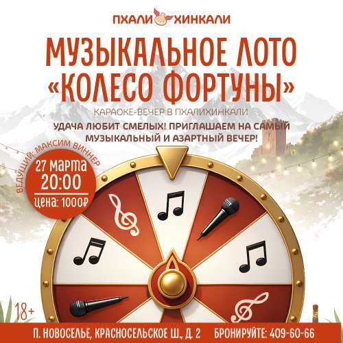 Музыкальное лото "Колесо фортуны" в "ПхалиХинкали"! Готовьтесь к незабываемому караоке-вечеру, где благосклонность фортуны улыбнется самым смелым и азартным! За штурвалом веселья — несравненный Максим Виннер!