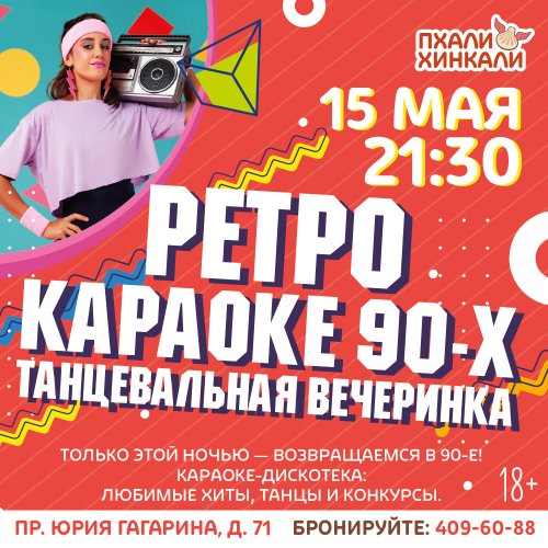 15 мая с 21:30 ресторан «ПхалиХинкали» на проспекте Юрия Гагарина, 71, приглашает вас окунуться в незабываемую атмосферу озорных 90-х! В эту ночь любимые хиты, зажигательные танцы и искромётные конкурсы перенесут нас на десятилетия назад.