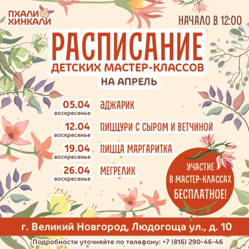 В апреле продолжаем творить волшебные кулинарные шедевры на детских мастер-классах в ресторанах "ПхалиХинкали" Псков. Что ждет юных кулинаров? Наши опытные повара откроют секреты приготовления самых разнообразных блюд. Ребята научатся: лепить и раскатывать хачапури и пиццури