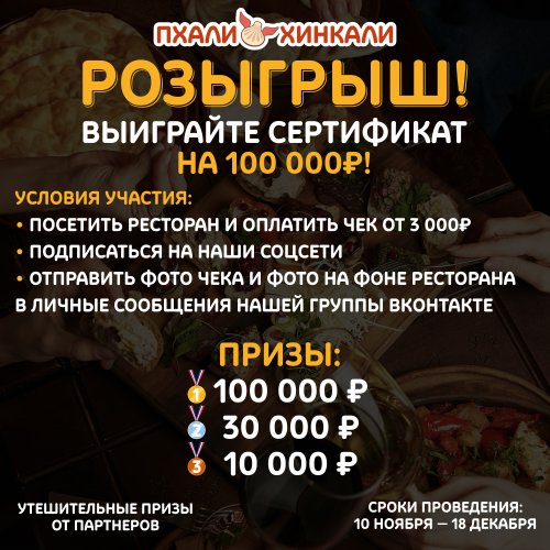 Большой розыгрыш в "ПхалиХинкали"! У вас есть шанс выиграть сертификат на 100 000 рублей и другие щедрые призы!