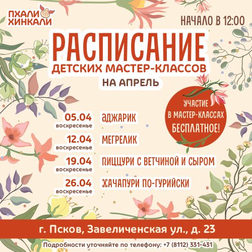 В апреле продолжаем творить волшебные кулинарные шедевры на детских мастер-классах в ресторанах "ПхалиХинкали" Псков. Что ждет юных кулинаров? Наши опытные повара откроют секреты приготовления самых разнообразных блюд. Ребята научатся: лепить и раскатывать хачапури и пиццури