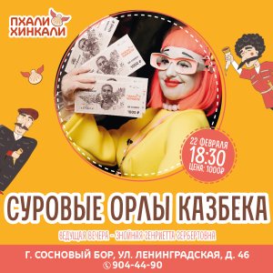 Приглашаем на праздничную программу 22 февраля с 18:30 в ресторане ПхалиХинкали Cосновый Бор! Ведущая Генриетта подарит заряд энергии вместе с программой "Суровые Орлы Казбека", посвящённую всем мужчинам! Стоимость 1000р, бронь: 904-44-90
