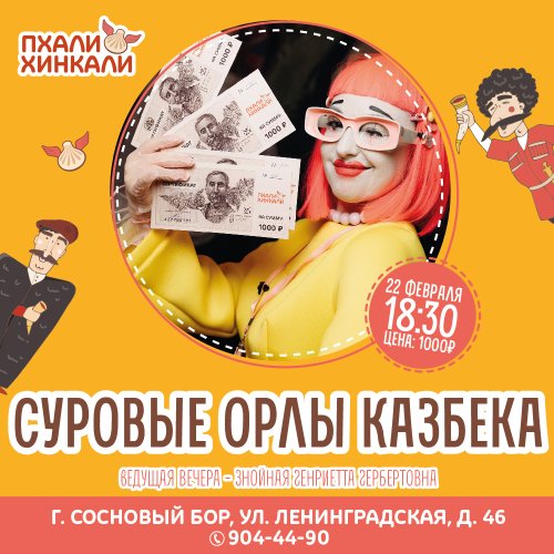 Приглашаем на праздничную программу 22 февраля с 18:30 в ресторане ПхалиХинкали Cосновый Бор! Ведущая Генриетта подарит заряд энергии вместе с программой "Суровые Орлы Казбека", посвящённую всем мужчинам! Стоимость 1000р, бронь: 904-44-90