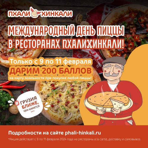 Только с 9 по 11 февраля дарим 200 баллов на карту лояльности при покупке каждой грузинской пиццы!